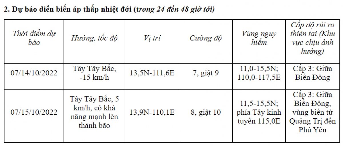 Trung tâm Dự báo Khí tượng Thủy văn Quốc gia cho biết, hồi 07 giờ, vị trí tâm áp thấp nhiệt đới ở vào khoảng 12,5 độ Vĩ Bắc; 115,1 độ Kinh Đông, trên khu vực Giữa Biển Đông, cách đảo Song Tử Tây khoảng 180km về phía Bắc. Sức gió mạnh nhất vùng gần tâm áp thấp nhiệt đới mạnh cấp 6 (39-49km/giờ), giật cấp 8. Di chuyển theo hướng Tây với tốc độ khoảng 10km/h.