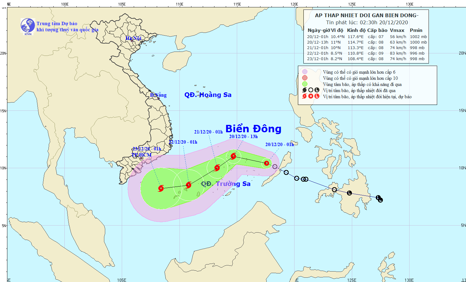 Dự báo trong 12 giờ tới, áp thấp nhiệt đới di chuyển theo hướng Tây Tây Bắc, mỗi giờ đi được khoảng 25km và có khả năng mạnh lên thành bão. Đến 13 giờ ngày 20/12, vị trí tâm bão ở khoảng 11,0 độ Vĩ Bắc; 114,7 độ Kinh Đông, ngay ở phía Nam đảo Song Tử Tây (quần đảo Trường Sa). Sức gió mạnh nhất vùng gần tâm bão mạnh cấp 8 (60-75km/giờ), giật cấp 10.