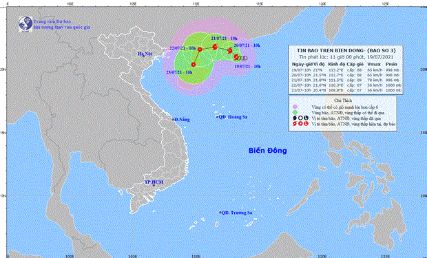 Từ 10 giờ ngày 20/7 bão di chuyển theo hướng Tây Tây Bắc, mỗi giờ đi được khoảng 5km, đến 10 giờ ngày 21/7, vị trí tâm bão ở khoảng 21,8 độ Vĩ Bắc; 111,5 độ Kinh Đông, trên vùng ven biển phía Tây Nam tỉnh Quảng Đông (Trung Quốc). Sức gió mạnh nhất vùng gần tâm bão mạnh cấp 8-9 (60-90 km/giờ), giật cấp 11.