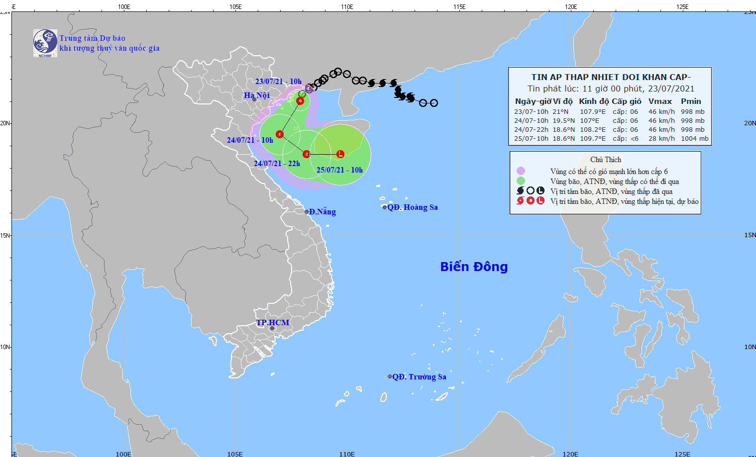 Dự báo trong 24 giờ tới, áp thấp nhiệt đới di chuyển theo hướng Tây Nam, mỗi giờ đi được khoảng 10km. Đến 10 giờ ngày 24/7, vị trí tâm áp thấp nhiệt đới ở khoảng 19,5 độ Vĩ Bắc; 107,0 độ Kinh Đông, cách Nam Định khoảng 100km về phía Đông Nam. Sức gió mạnh nhất vùng gần tâm áp thấp nhiệt đới mạnh cấp 6 (40-50km/giờ), giật cấp 8.