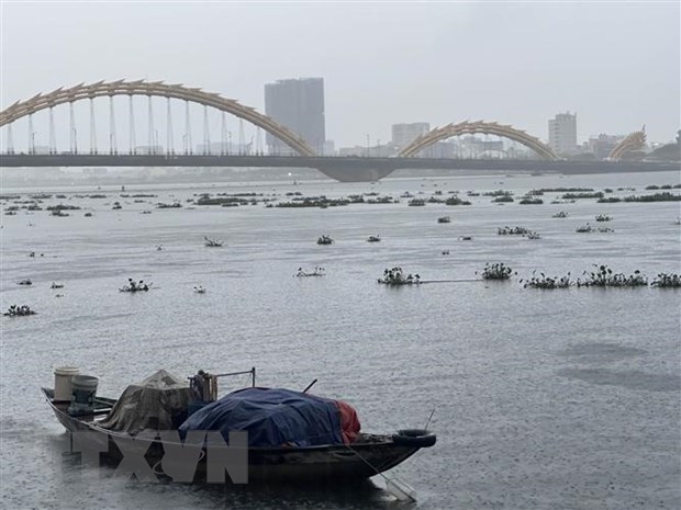 Nước thượng nguồn đổ về sông Hàn kèm theo bèo rác. (Ảnh: Trần Lê Lâm/TTXVN)