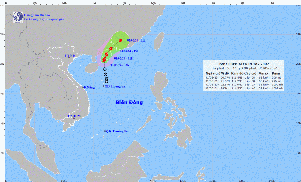 Đến 1 giờ ngày 01/6, bão số 1 ở vào khoảng 21,6 độ vĩ bắc, 112,2 độ kinh đông; trên vùng biển phía nam tỉnh Quảng Đông (Trung Quốc). Bão mạnh cấp 8, giật cấp 10.