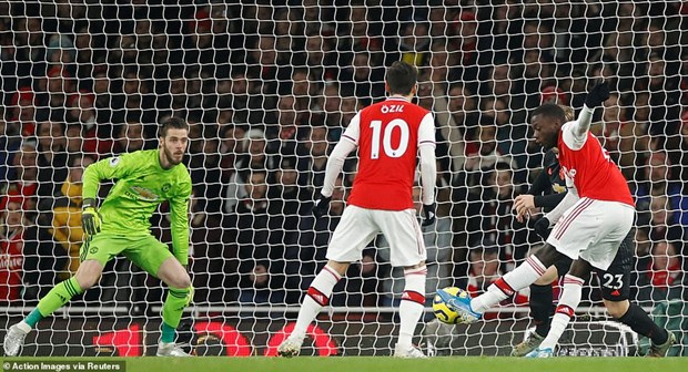 Ngay phút thứ 8, Sead Kolasinac thực hiện đường căng ngang vào trong, bóng đập chân Victor Lindelof tìm đến đúng vị trí của Nicolas Pepe.