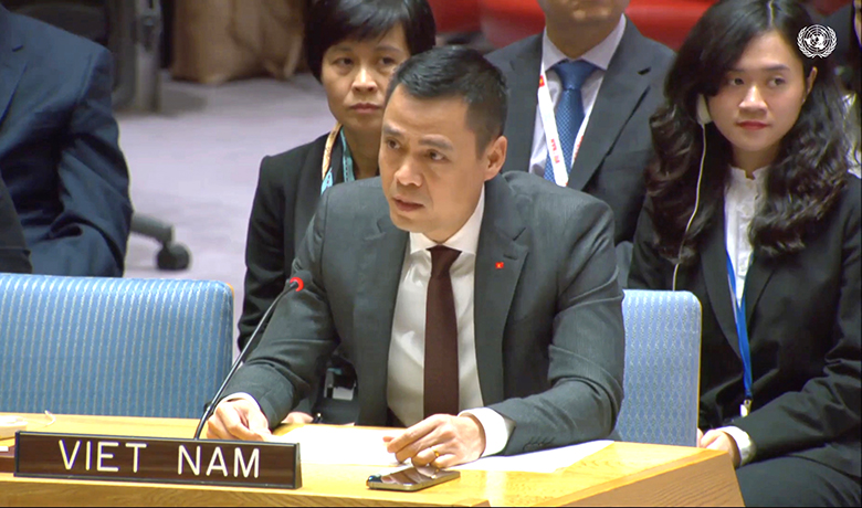 | Đại sứ Đặng Hoàng Giang, Trưởng Phái đoàn thường trực Việt Nam tại Liên hợp quốc phát biểu tại phiên thảo luận (Ảnh: UN Web TV) |
