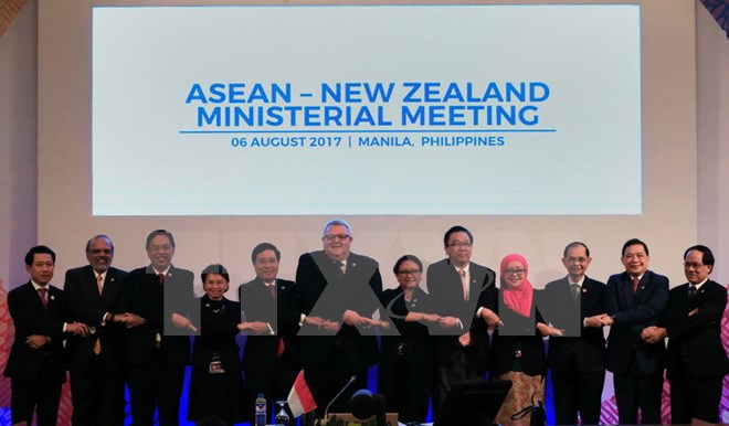 Phó Thủ tướng kiêm Bộ trưởng Ngoại giao Việt Nam Phạm Bình Minh (thứ 5 trái) tham dự Hội nghị Bộ trưởng Ngoại giao ASEAN và New Zealand tại Manila, Philippines, ngày 06/8. (Nguồn: AFP/TTXVN)