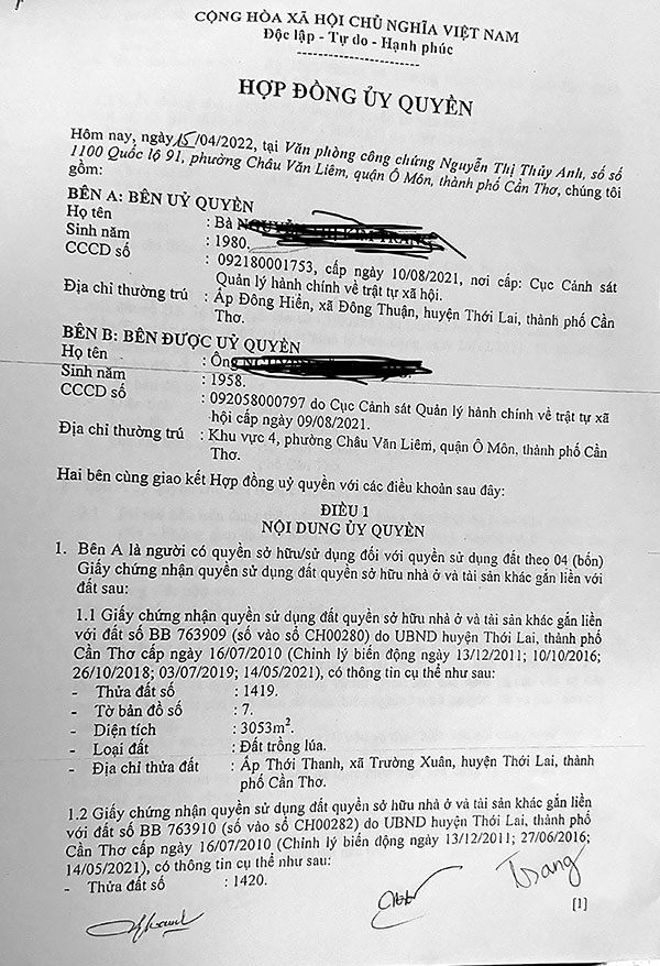 Mấy ngày nay, bà N.T.K.T ở xã Ðông Thuận, huyện Thới Lai, như "ngồi trên đống lửa" khi phát hiện ông N.V.H - người được bà ủy quyền thực hiện một số thủ tục liên quan đến đất đai, đã lợi dụng sự ủy quyền đó để chuyển nhượng quyền sử dụng đất cho người khác. Bà K.T đã có đơn cầu cứu, yêu cầu chính quyền và ngành chức năng địa phương ngăn chặn việc chuyển nhượng. Mặt khác, bà cũng có đơn khởi kiện yêu cầu hủy bỏ hợp đồng ủy quyền giữa bà và ông H được ký kết trước đó, tại một văn phòng công chứng.
