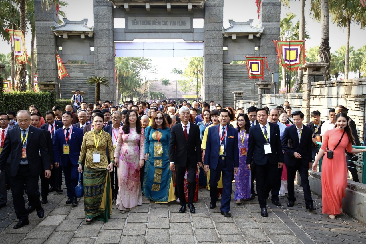 | Thứ trưởng Bộ Ngoại giao Lê Thị Thu Hằng và Phó Chủ tịch UBND TP Hồ Chí Minh Võ Văn Hoan dẫn đầu đoàn kiều bào đến dâng hương tưởng niệm các vua Hùng tại Công viên Lịch sử - Văn hóa dân tộc (TP Thủ Đức, TP Hồ Chí Minh). |