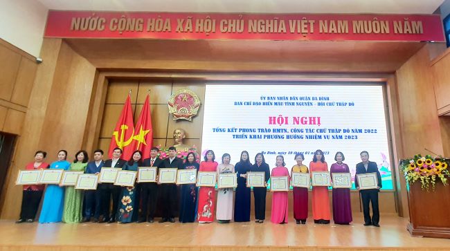 Dịp này, để ghi nhận những kết quả trong phòng trào HMTN và công tác CTĐ mà các cấp Hội đã đạt được trong năm qua, Ban tổ chức đã tổ chức trao tặng Giấy khen của Chủ tịch UBND quận Ba Đình tặng thưởng 39 tập thể và 117 cá nhân có thành tích xuất sắc trong công tác HMTN; Tặng cờ thi đua xuất sắc của Trung ương Hội CTĐ VN giai đoạn 2018-2022 cho Hội CTĐ Quận Ba Đình; tặng Bằng khen của Trung ương Hội CTĐ Việt Nam cho 4 tập thể, 9 cá nhân của quận Ba Đình; Khen thưởng của Hội CTĐ thành phố Hà Nội cho 05 tập thể và và 20 cá nhân; Tặng Bằng khen của Trung ương Hội CTĐ Việt Nam cho 4 tập thể, 9 cá nhân của quận Ba Đình; Khen thưởng của Hội CTĐ thành phố Hà Nội cho 05 tập thể và và 20 cá nhân quận Ba Đình có thành tích xuất sắc trong công tác CTĐ năm 2022./.
