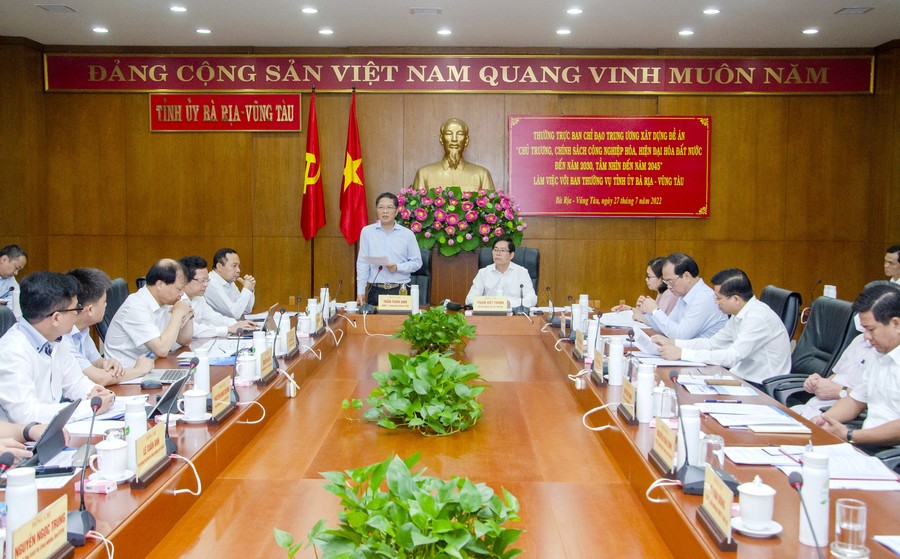 Ngày 27/7, tại tỉnh Bà Rịa – Vũng Tàu , Thường trực Ban Chỉ đạo Trung ương xây dựng Đề án do đồng chí Trần Tuấn Anh, Ủy viên Bộ Chính trị, Trưởng Ban Kinh tế Trung ương làm trưởng đoàn đã đến làm việc và khảo sát tại địa phương để phục vụ Dự thảo Đề án "Chủ trương, chính sách công nghiệp hóa, hiện đại hóa đến năm 2030, tầm nhìn đến năm 2045” trong bối cảnh và điều kiện mới, trình Hội nghị Trung ương 6 khóa XIII sắp tới.