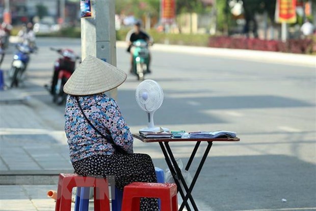 Người bán vé số dùng quạt tích điện đối phó với nắng nóng - Ảnh: Phan Tuấn Anh/TTXVN