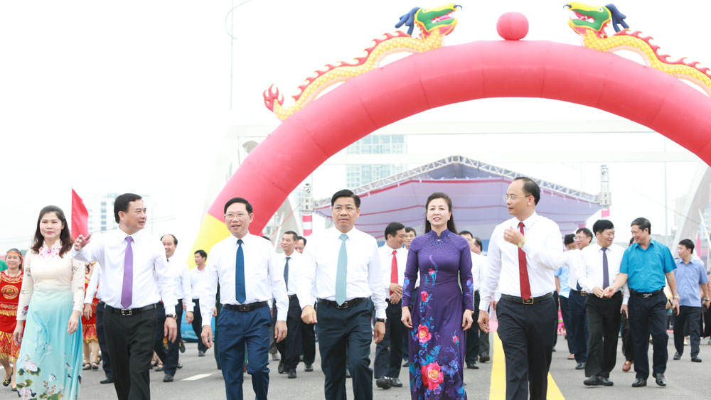 | Hình ảnh tại Lễ khánh thành cầu Á Lữ. Trong ảnh: Các đồng chí Lãnh đạo tỉnh Bắc Giang đi bộ qua cầu sau lễ cắt băng khánh thành. |