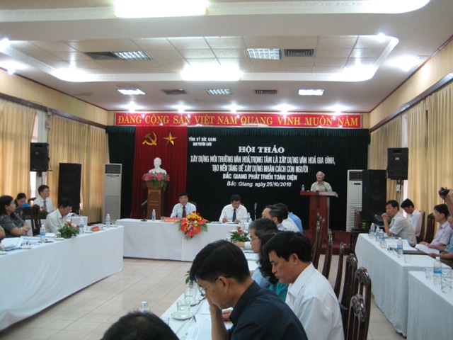 Đồng chí Đỗ Đức Hà, Ủy viên Ban Thường vụ Tỉnh ủy, Trưởng ban Tuyên giáo Tỉnh ủy Bắc Giang nêu rõ mục đích của Hội thảo này là hướng đến việc xác định các giải pháp ngăn chặn có hiệu quả những biểu hiện xuống cấp về đạo đức xã hội. Xây dựng môi trường văn hóa, văn hóa gia đình để tạo nền tảng vững chắc xây dựng con người Bắc Giang phát triển toàn diện về thể lực, trí lực, có nhân cách, lối sống cao đẹp; có hành vi ứng xử thân thiện, văn minh, lịch sự trong quan hệ gia đình, làng xóm, nơi công cộng; góp phần xây dựng hình ảnh, quảng bá thương hiệu Bắc Giang trong nước và thế giới.Hội thảo là dịp để trao đổi, thảo luận làm rõ những vấn đề về lý luận về xây dựng môi trường văn hóa và văn hóa gia đình trong giai đoạn hiện nay; thực trạng về môi trường văn hóa, văn hóa gia đình ở Bắc Giang; những kinh nghiệm trong việc gìn giữ và phát huy giá trị văn hóa gia đình, kinh nghiệm nuôi, dạy, giáo dục con cháu trong gia đình; nêu ra những ý tưởng, đề xuất kiến nghị các giải pháp xây dựng môi trường văn hóa và văn hóa gia đình, xây dựng nhân cách con người Bắc Giang phát triển toàn diện.