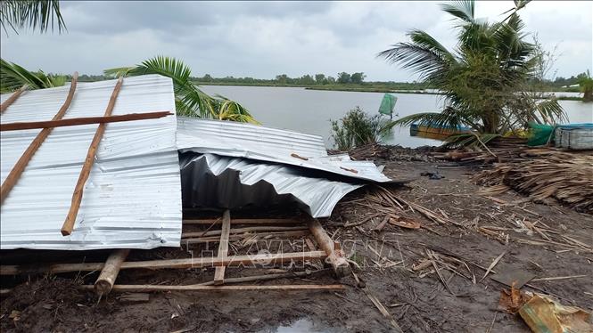 | Mưa to, giông lốc khiến nhiều nhà bị sập, tốc mái. Ảnh: Chanh Đa - TTXVN |