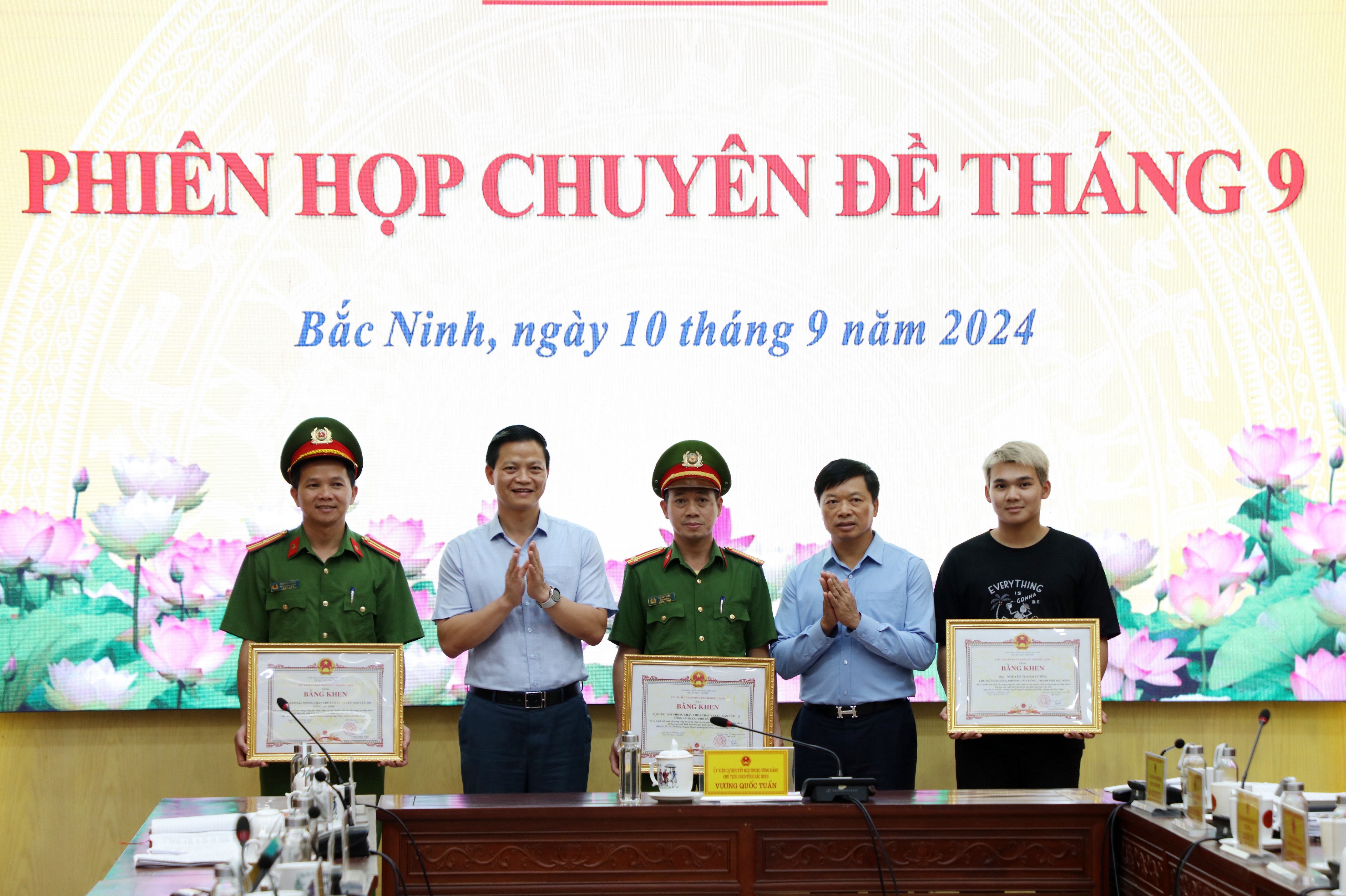 Đồng thời, Chủ tịch UBND tỉnh Bắc Ninh quyết định khen thưởng đột xuất các tập thể, cá nhân có thành tích xuất sắc xử lý sự cố thiên tai, cụ thể, trao Bằng khen cho Phòng Cảnh sát phòng cháy chữa cháy và cứu nạn cứu hộ (Công an tỉnh); Đội Cảnh sát phòng cháy chữa cháy và cứu nạn cứu hộ (Công an thành phố Bắc Ninh); Trung tá Phạm Văn Tiền, Đội trưởng, Phòng Cảnh sát phòng cháy chữa cháy và cứu nạn cứu hộ (Công an tỉnh); Hạ sỹ Nguyễn Văn Tuấn, chiến sĩ nghĩa vụ, Phòng Cảnh sát phòng cháy chữa cháy và cứu nạn cứu hộ (Công an tỉnh); Thiếu tá Nguyễn Phi Phương, Phó Đội trưởng, Đội Cảnh sát phòng cháy chữa cháy và cứu nạn cứu hộ (Công an thành phố Bắc Ninh); Hạ sỹ Trần Văn Thịnh, chiến sĩ nghĩa vụ, Đội Cảnh sát phòng cháy chữa cháy và cứu nạn cứu hộ (Công an thành phố Bắc Ninh); ông Nguyễn Thanh Cường, Khu phố Hòa Đình, phường Võ Cường, thành phố Bắc Ninh và ông Nguyễn Thanh Sơn, Khu 6, phường Đại Phúc, thành phố Bắc Ninh có thành tích xuất sắc trong công tác chữa cháy và cứu người, cứu tài sản trong vụ cháy nhà ở kết hợp sản xuất kinh doanh hộ gia đình ông Ngô Văn Tiến, đường Nguyễn Quyền, phường Đại Phúc, thành phố Bắc Ninh.