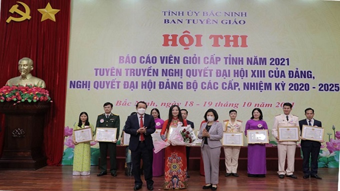 Đặc biệt, mới đây, Ban Tuyên giáo Tỉnh ủy Bắc Ninh đã tham mưu giúp Thường vụ Tỉnh ủy tổ chức Hội thi Báo cáo viên giỏi cấp tỉnh năm 2021. Tham dự Hội thi có 11 thí sinh là báo cáo viên tiêu biểu được chọn từ Hội thi của các Đảng bộ trực thuộc Tỉnh uỷ. Nội dung dự thi của các thí sinh đã tập trung vào tuyên truyền Nghị quyết Đại hội lần thứ XIII của Đảng, nghị quyết đại hội đảng bộ các cấp, nhiệm kỳ 2020 - 2025 với nhiều chuyên đề có chất lượng như: Những nhiệm vụ trọng tâm trong nhiệm kỳ Đại hội XIII của Đảng (Đảng bộ huyện Thuận Thành); Điểm mới trong văn kiện Đại hội XIII của Đảng về “Khát vọng phát triển đất nước phồn vinh, hạnh phúc” (Đảng bộ huyện Tiên Du); Phát huy sức mạnh khối đại đoàn kết toàn dân tộc theo tinh thần Nghị quyết Đại hội XIII của Đảng trong công tác phòng, chống dịch COVID-19, quyết tâm thực hiện “mục tiêu kép” (Đảng bộ Khối Các cơ quan và Doanh nghiệp tỉnh); Những nhận thức mới và tư duy mới về quốc phòng Việt Nam trong văn kiện Đại hội XIII của Đảng (Đảng bộ Quân sự tỉnh)...