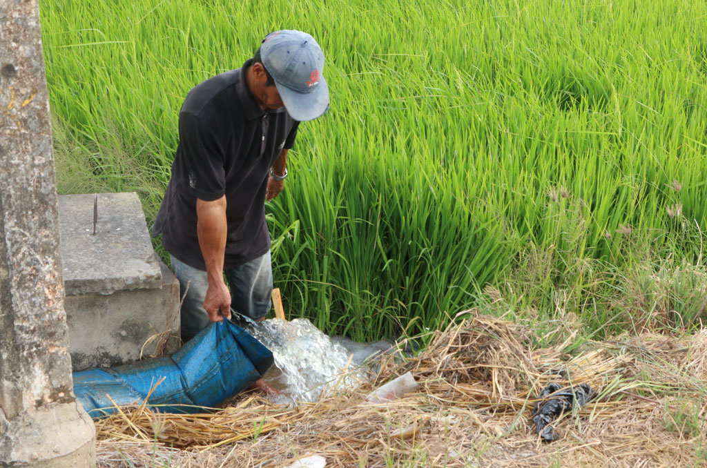 Người dân tại huyện Tân Trụ bơm nước từ kênh với hy vọng cứu lúa
