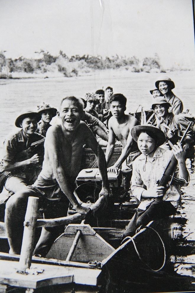 | Bức ảnh O Thu cùng cha chèo đò chở bộ đội qua sông do nhà báo Đoàn Công Tính chụp |