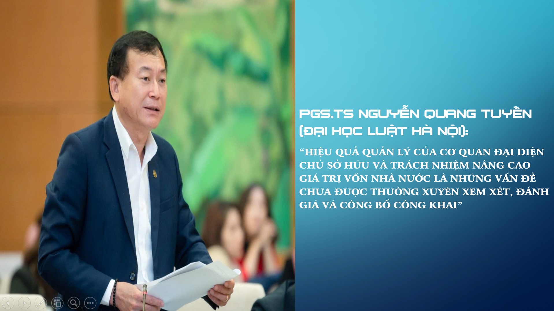 Mặt khác, theo PGS.TS Nguyễn Quang Tuyến (Đại học Luật Hà Nội), hệ thống quy định của pháp luật chưa quy định đầy đủ về việc giám sát cơ quan chủ sở hữu. Hiệu quả quản lý của cơ quan đại diện chủ sở hữu và trách nhiệm nâng cao giá trị vốn nhà nước là những vấn đề chưa được thường xuyên xem xét, đánh giá và công bố công khai. Do thiếu cơ chế giám sát, đánh giá thường xuyên đối với cơ quan đại diện chủ sở hữu nên không tạo được áp lực cho các cơ quan đại diện chủ sở hữu (Bộ, ngành, Ủy ban nhân dân cấp tỉnh...) phải quản lý vốn nhà nước tốt hơn, hiệu quả hơn.