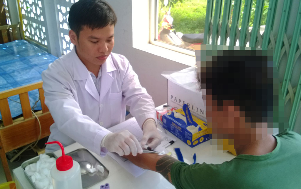 Cán bộ y tế xét nghiệm máu người nghiện chích ma túy để xác định tỷ lệ nhiễm HIV