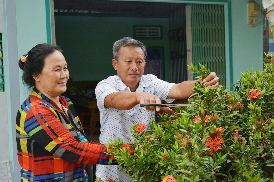 Vợ chồng ông Phạm Thành Kiệt, ngụ ấp Vĩnh Hiệp, xã Hòa Chánh cắt tỉa cây kiểng trước nhà, tạo mỹ quan, chung sức xây dựng nông thôn mới.