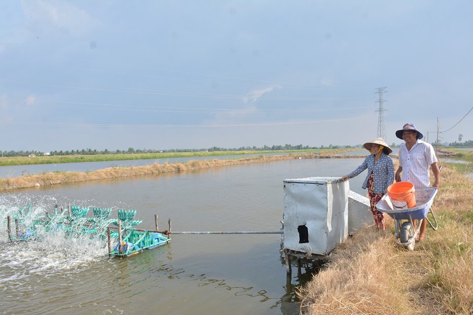Vợ chồng anh Huỳnh Văn Nguyện, ngụ ấp Vĩnh Hiệp, xã Hòa Chánh thăm vuông tôm của gia đình.