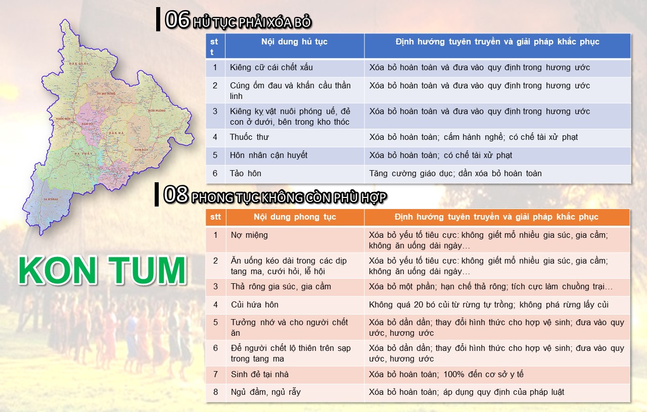 Trong quá trình thực hiện, các kinh nghiệm của Hà Giang là rất đáng tham khảo. Hay như tỉnh Kon Tum, UBND tỉnh cũng đã ban hành Quyết định về danh mục để định hướng xóa bỏ hoàn toàn 06 hủ tục bằng cách đưa vào điều cấm trong hương ước, quy ước của làng; xóa bỏ một số yếu tố có ảnh hưởng tiêu cực không còn phù hợp với đời sống xã hội đối với 08 phong tục của đồng bào DTTS.