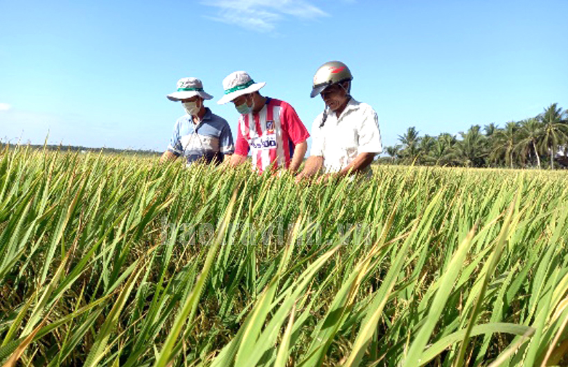 Nông dân lân cận đến tham quan, học hỏi kinh nghiệm trong sản xuất lúa của ông Trương Văn Hải, ấp Ông Rùm, xã Hùng Hòa.