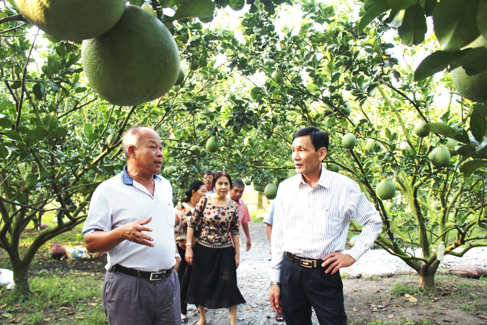 Chủ tịch Hội Nông dân Việt Nam tỉnh Long An- Phạm Chí Tâm (bìa phải) có chuyến trao đổi, học tập kinh nghiệm trồng bưởi da xanh của ông Lâm Hữu Cuộc