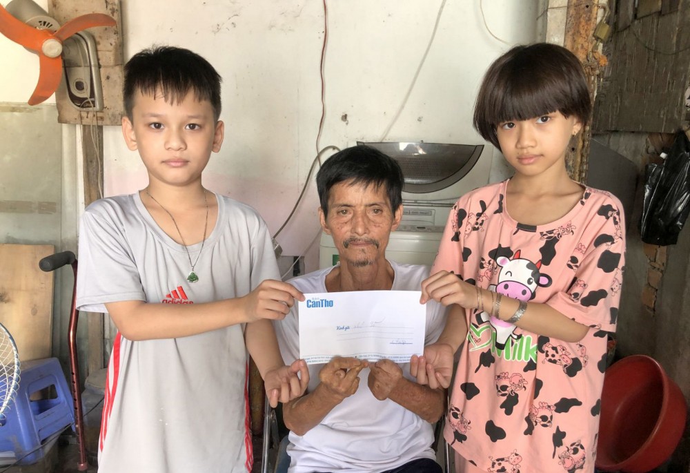 Ông Trần Văn Sỹ cùng 2 cháu nội rất vui khi nhận số tiền của bạn đọc Báo Cần Thơ gởi giúp.