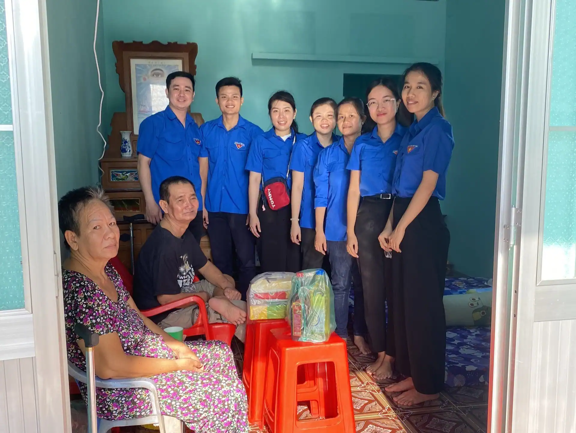 Đoàn viên thanh niên đến dọn dẹp và tặng quà cho vợ chồng ông Trần Ngọc Thanh.