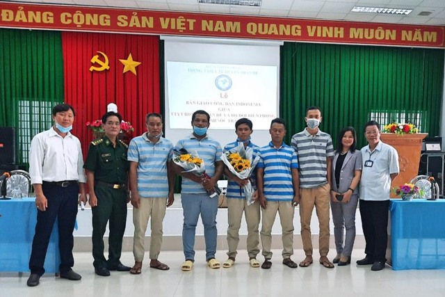 | 5 thuyền viên Indonesia cùng đại diện các cơ quan đơn vị tại buổi lễ bàn giao. |
