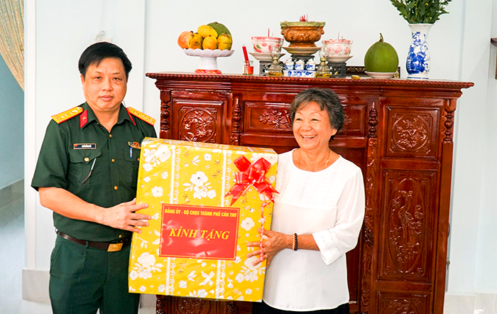 Đại tá Ngô Công Đô, Phó Chính ủy Bộ CHQS TP Cần Thơ tặng quà của Đảng ủy, Bộ CHQS thành phố cho bà Lưu Thị Hiền trong lễ bàn giao nhà.