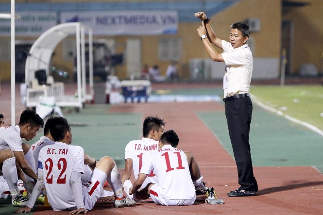 HLV Hoàng Anh Tuấn chỉ đạo học trò trong giờ nghỉ giải lao. Ảnh: Anh Hoàng