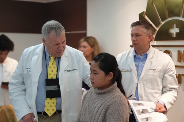 Chuyên gia đến từ nước Mỹ khám cho trẻ em trước khi phẫu thuật. (Ảnh: PV/Vietnam+)
