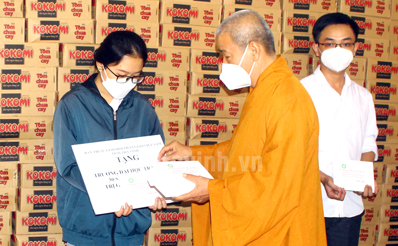 Hòa thượng Thích Trí Minh trao học bổng cho sinh viên Trường Đại học Trà Vinh.