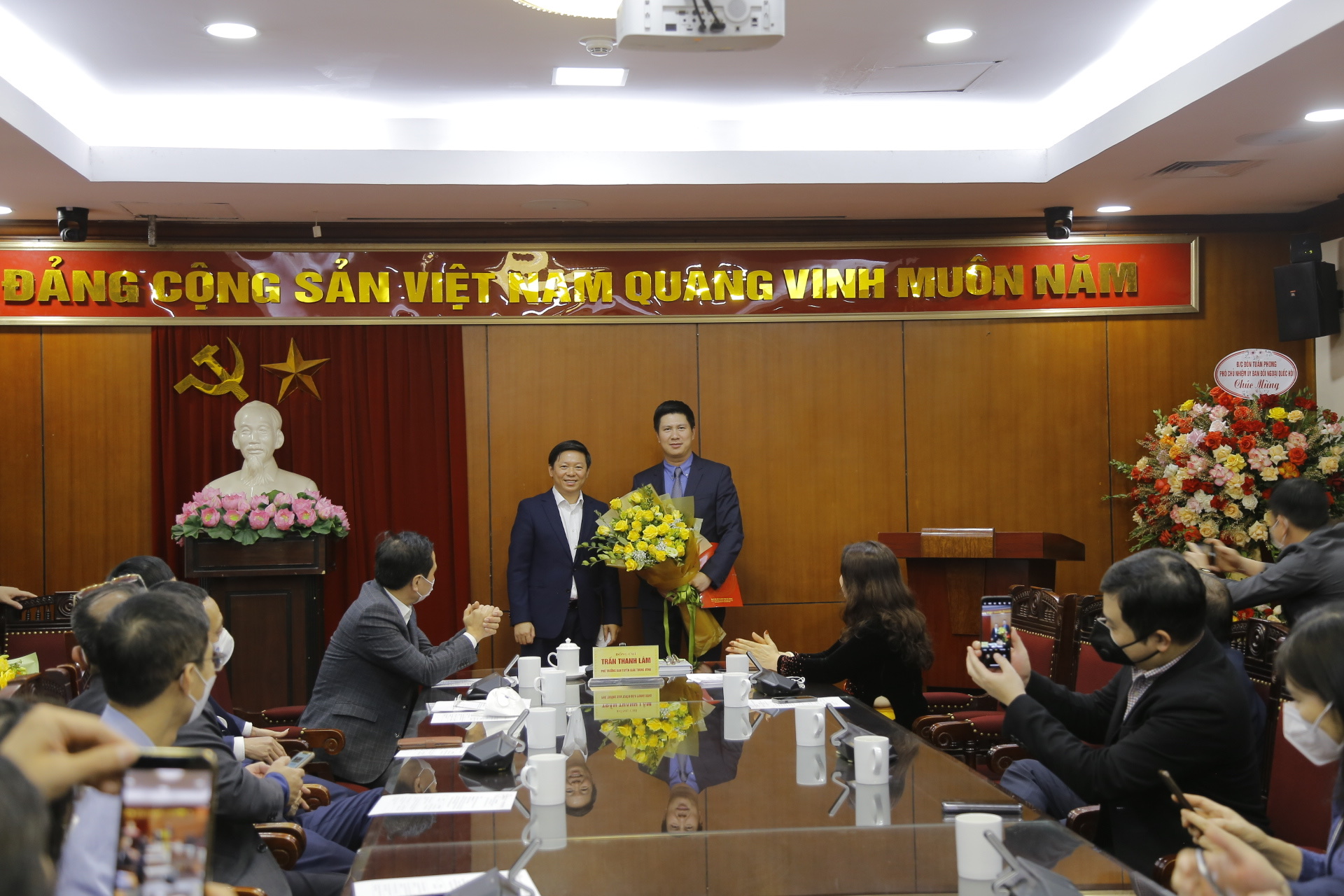 | Đồng chí Trần Thanh Lâm, Phó Trưởng ban Tuyên giáo Trung ương, trao Quyết định tiếp nhận, bổ nhiệm cho tân Vụ trưởng Vụ Thông tin đối ngoại và Hợp tác quốc tế. |