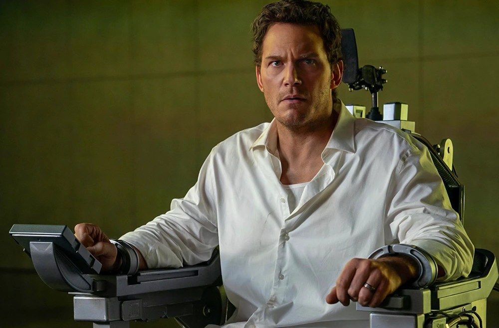 Chris Raven (Chris Pratt) ngồi ghế bị cáo và bị phiên tòa AI xét xử trong phim.