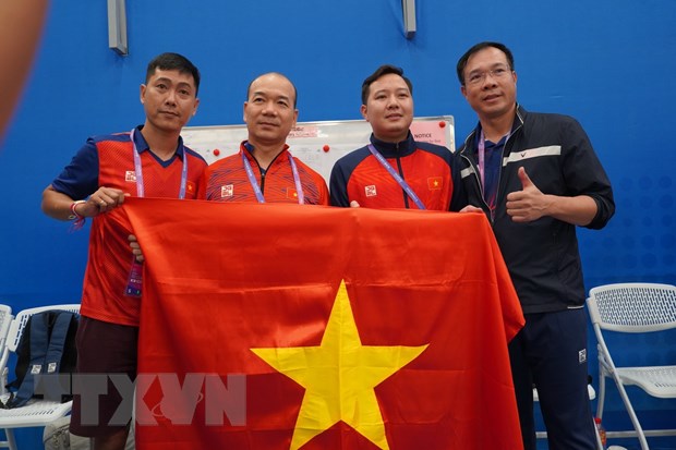Xạ thủ Hữu Vượng (thứ 2 từ phải qua) chia vui cùng Ban huấn luyện. (Ảnh: Hoàng Linh/TTXVN)