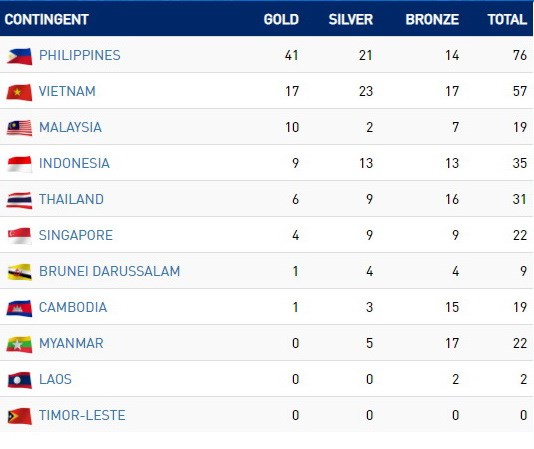 Đoàn Việt Nam đang xếp thứ 2, đứng sau chủ nhà Philippines (41 huy chương vàng, 21 huy chương bạc và 14 huy chương đồng).