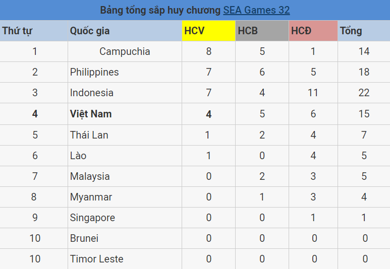 Đoàn chủ nhà Campuchia hiện vẫn đang dẫn đầu bảng tổng sắp với 8 huy chương Vàng, 5 huy chương Bạc và 2 huy chương Đồng.
