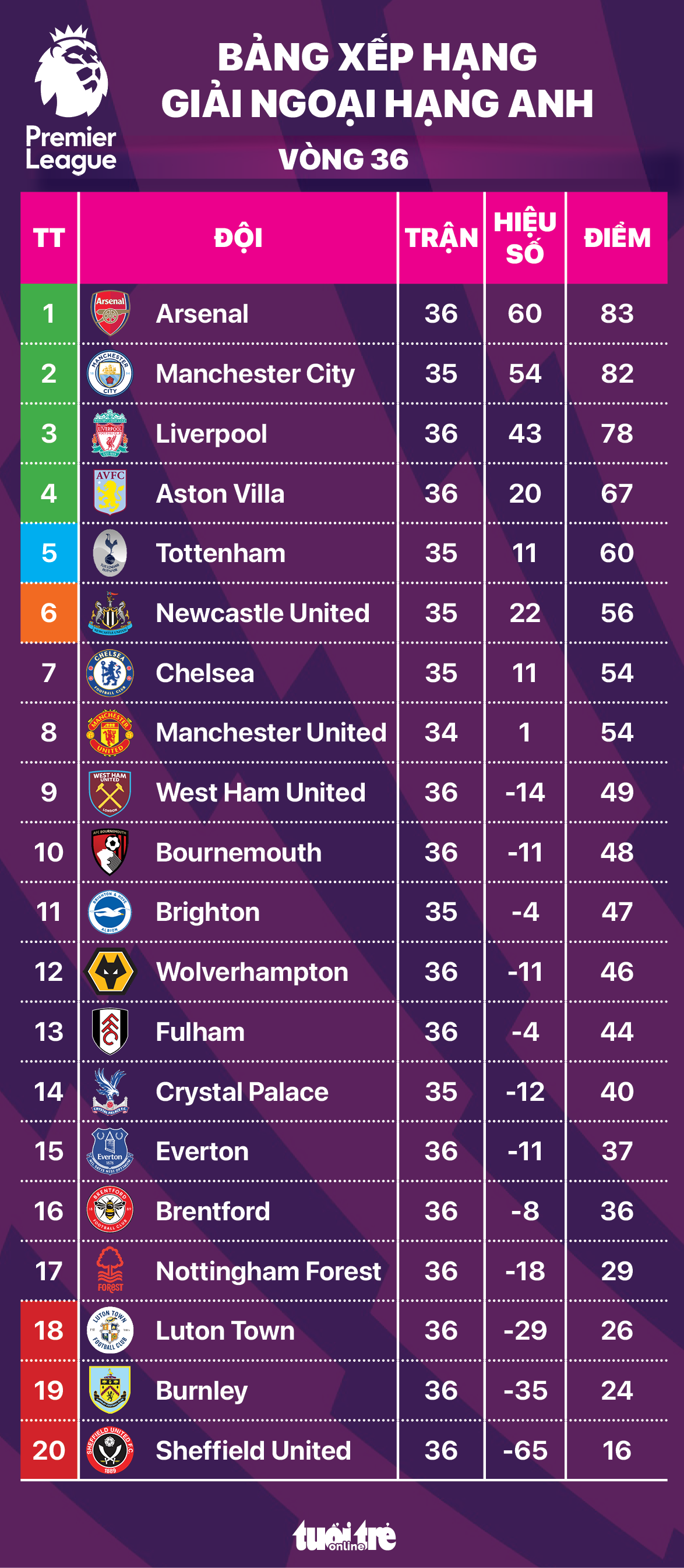 Bảng xếp hạng Ngoại hạng Anh sau vòng 36. (Đồ họa: AN BÌNH)