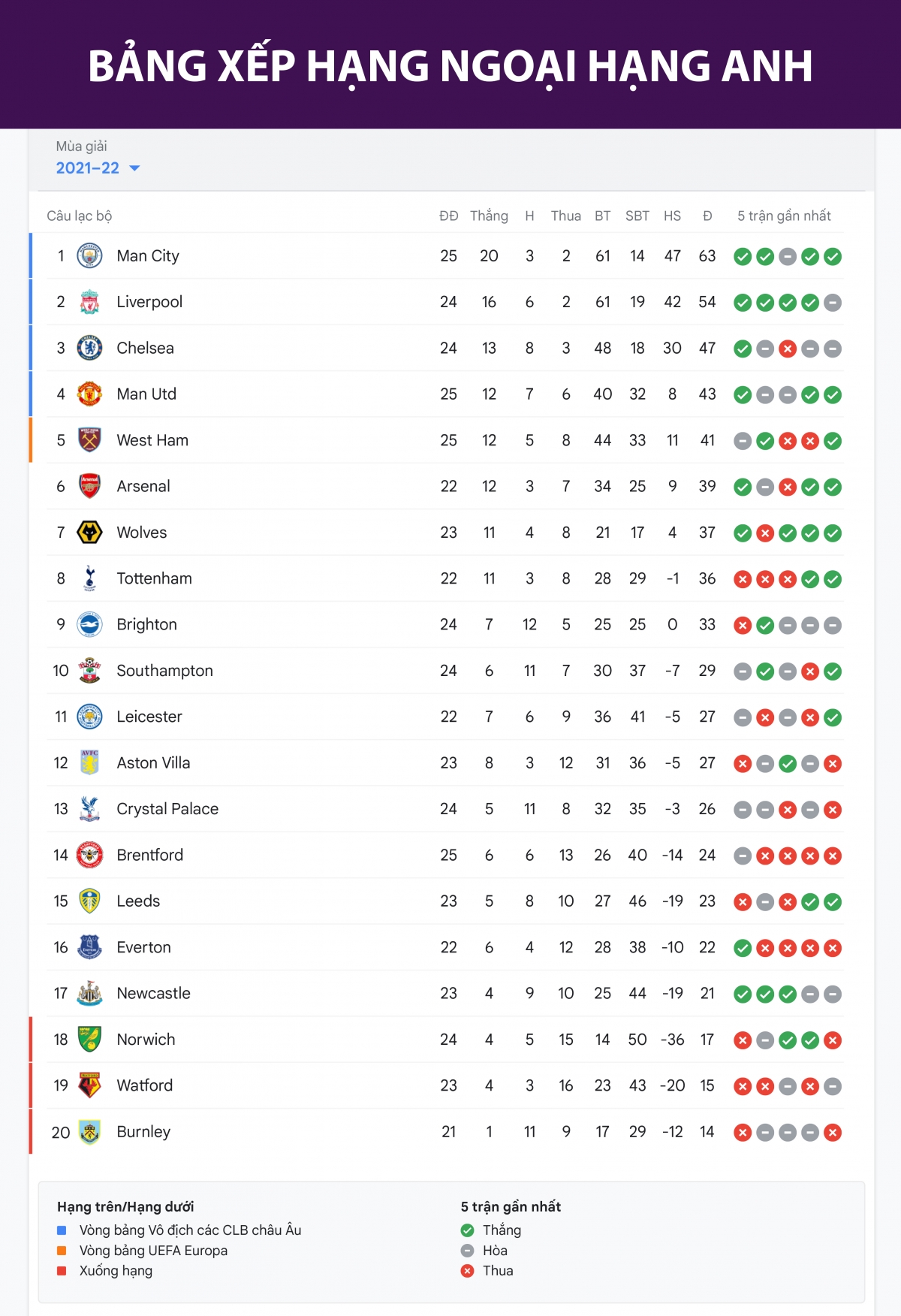 Cập nhật bảng xếp hạng Ngoại hạng Anh mới nhất tính đến ngày 16/2 như sau: Man City dẫn đầu với 63 điểm, các vị trí tiếp theo là Liverpool (54 điểm), Chelsea (47 điểm), MU (43 điểm), West Ham (41 điểm). Ba vị trí cuối vẫn là Norwichj City (17 điểm), Watford (15 điểm) và Burnley (14 điểm)./.