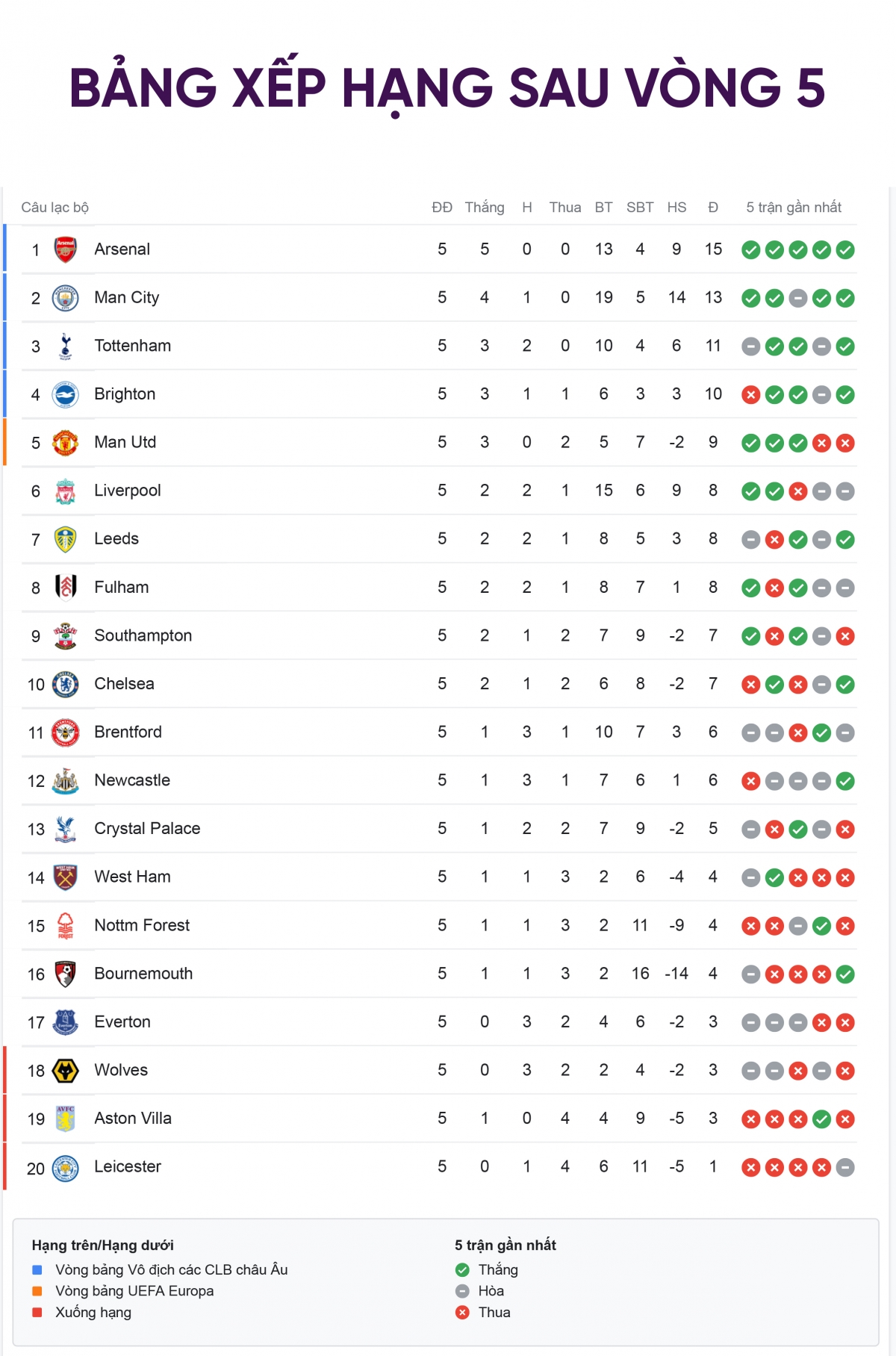 Cập nhật bảng xếp hạng Ngoại hạng Anh sau vòng đấu thứ 5, Arsenal dẫn đầu với 15 điểm. Pháo thủ cũng là đội bóng duy nhất tính đến thời điểm này duy trì thành tích toàn thắng.