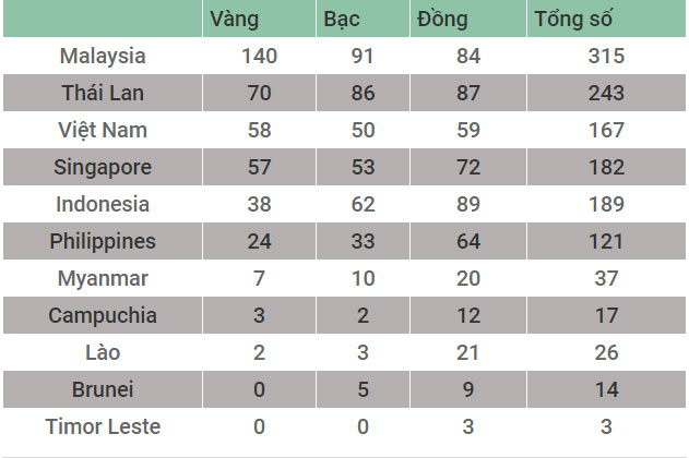 Đoàn Malaysia (140 huy chương vàng) xếp vị trí nhất toàn đoàn tại SEA Games 29, trong khi Thái Lan cũng đã nắm vị trí thứ 2 khi đã giành được tổng cộng 70 huy chương vàng.