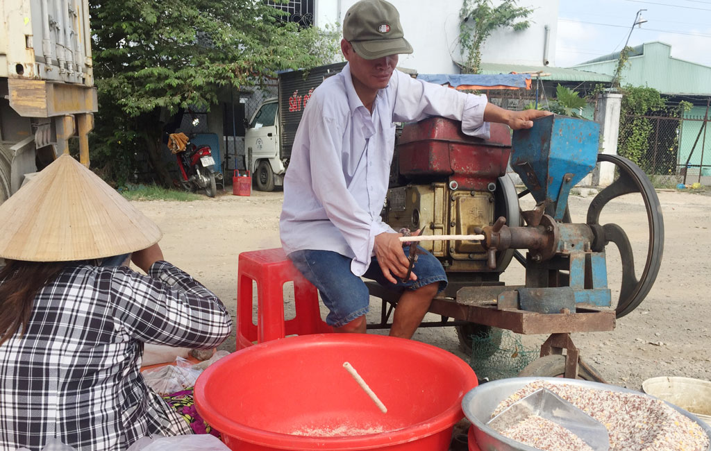 Ngoài bánh ống, anh chị còn làm thêm bánh cốm, đây cũng là món bánh bán khá đắt. Một ngày của anh chị bắt đầu từ 6 giờ sáng - anh làm bánh, chị cho vào bịch, cứ thế đến 10 giờ được khoảng 60 bịch. Tất cả từ bánh cốm, bánh ống gạo tẻ thơm hay bánh ống gạo lứt đều có giá 10.000 đồng. Cũng có người không mua bánh xay sẵn mà mang gạo đến xay, với 1kg gạo, anh chị lấy tiền công 15.000 đồng.