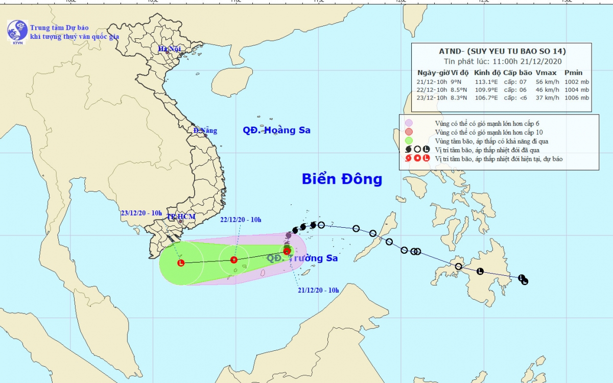 Dự báo trong 24 giờ tới, áp thấp nhiệt đới di chuyển theo hướng Tây Tây Nam, mỗi giờ đi được 10-15km. Đến 10 giờ ngày 22/12, vị trí tâm áp thấp nhiệt đới ở khoảng 8,5 độ Vĩ Bắc; 109,9 độ Kinh Đông, cách Huyền Trân khoảng 100km về phía Tây Tây Bắc. Sức gió mạnh nhất vùng gần tâm áp thấp nhiệt đới mạnh cấp 6 (40-50km/giờ), giật cấp 8.