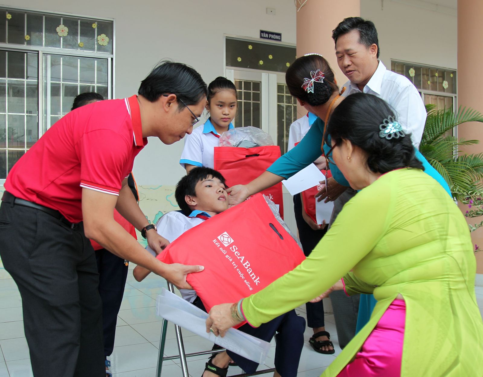 Em Trần Lâm Phúc Toàn nhận quà và học bổng từ SeABank. Ảnh: Nguyễn Minh