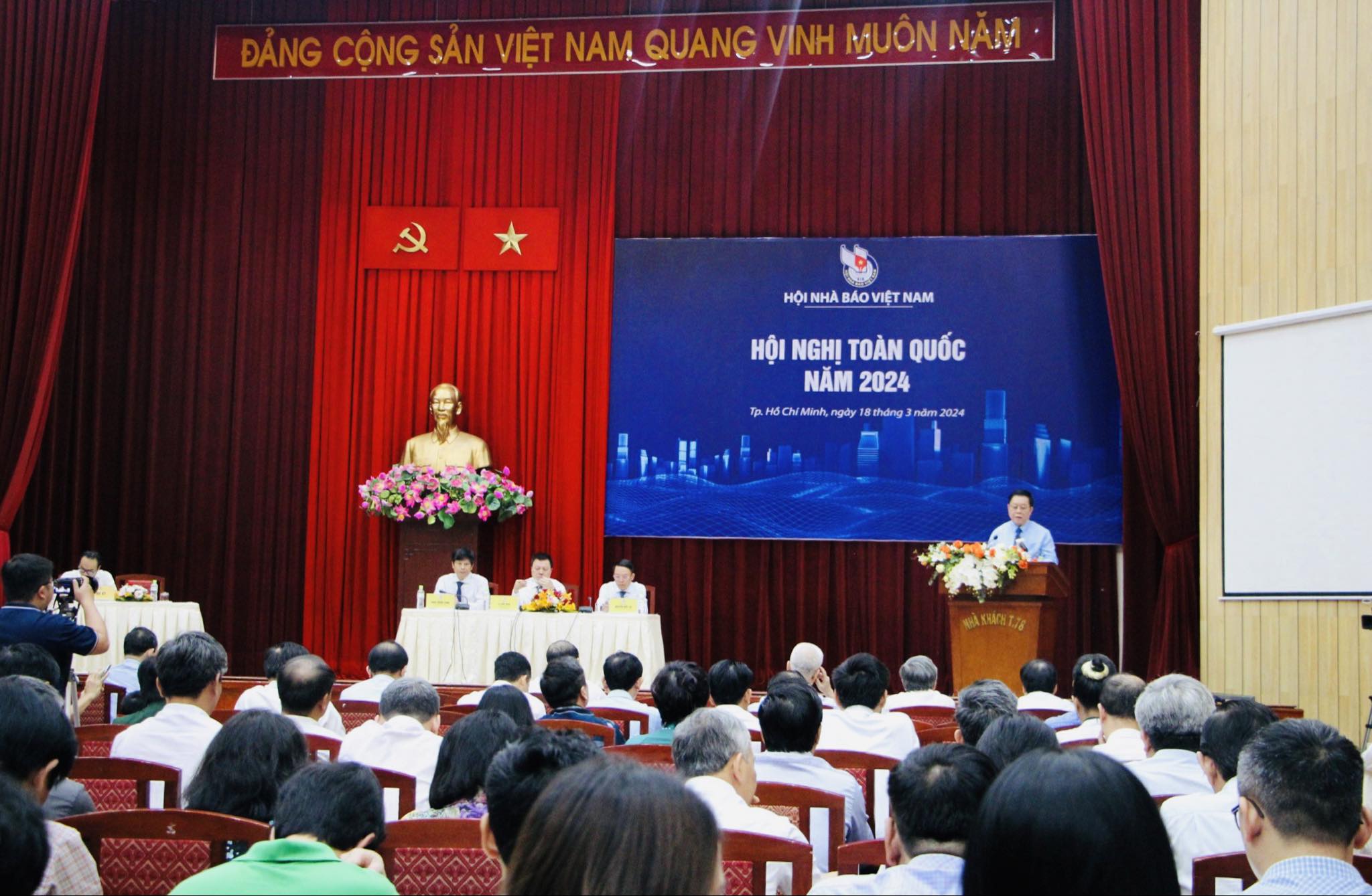 Chủ trì hội nghị có các đồng chí: Lê Quốc Minh, Tổng Biên tập Báo Nhân dân, Phó Trưởng Ban Tuyên giáo Trung ương, Chủ tịch Hội Nhà báo Việt Nam; Nguyễn Đức Lợi, Phó Chủ tịch Thường trực Hội Nhà báo Việt Nam; Trần Trọng Dũng, Phó Chủ tịch Hội Nhà báo Việt Nam.