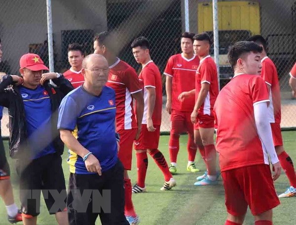 Huấn luyện viên Park Hang Seo và các cầu thủ Olympic Việt Nam tập tại sân Samsung thuộc Tây Java của Indonesia. (Ảnh: Trọng Tuệ/TTXVN)