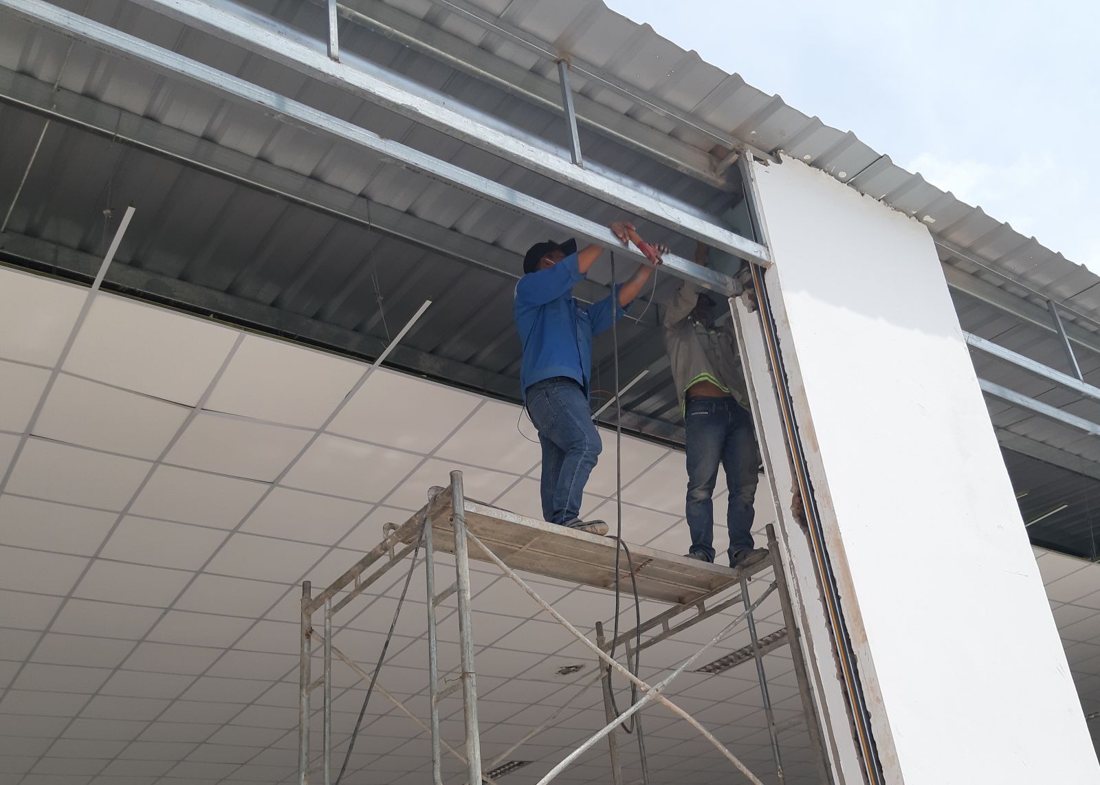 Làm việc trên cao cần được bảo hộ (Trong ảnh: Công nhân thi công hệ thống điện cho một nhà kho ở xã Long Thượng, huyện Cần Giuộc)